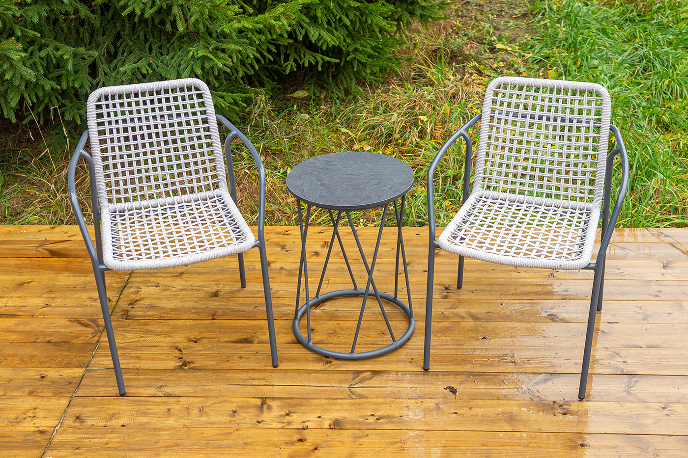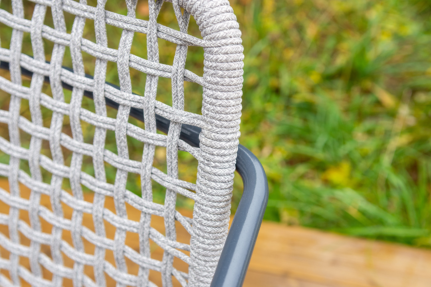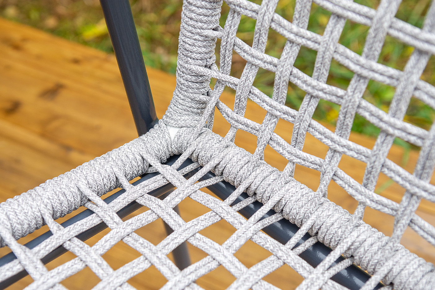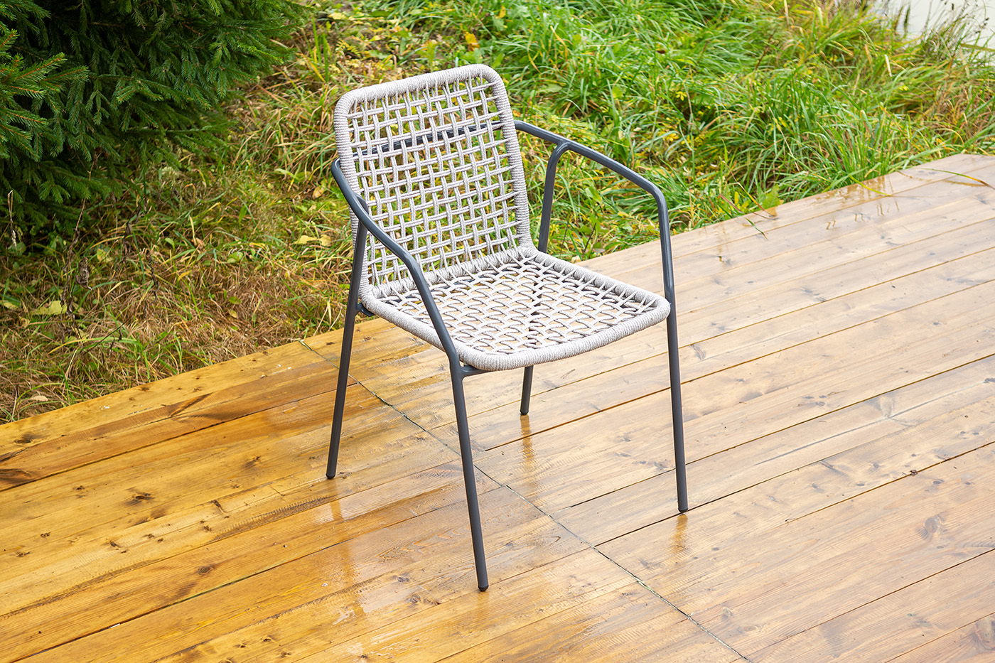 Стул «Тунис» — плетеная модель из роупа (полиэфирной веревки) с алюминиевым каркасом темно‑серого цвета (RAL7024).