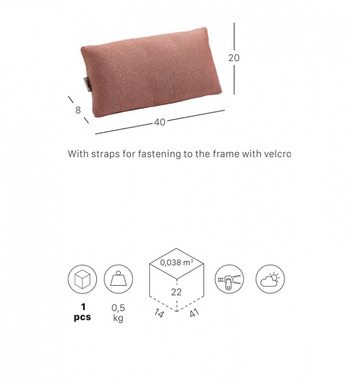 Дизайн: Gumdesign. Мягкая подушка-подголовник является идеальным дополнением для лаунж креселDress Code Smart иGlam. КоллекцияDress Codeвдохновленаканонами высокой моды. Дизайнеры постарались воспроизвести игру с сочетаниями цветов конструкций и сидений,с рисунками тканей для внутреннего и уличного использования. Версия креслаSmart выполнена с применениемгладкихи плоскихтканей, аверсияGlam отличаетсястеганым рисунком из больших квадратов. Особенности: Подушка может быть выполнена из тканей коллекций Acrylic (водо- и грязестойкий акрил),Sunbrella (огнестойкий, дышащий, водо- и грязестойкий, устойчивыйк плесени иультрафиолетовому излучению акрил). Подушка крепится к раме ремнями на липучке. Варианты цвета можно выбрать из палитры.Посмотреть палитру обивок. Цена на сайте указана за модель из ткани коллекции Acrylic.Для уточнения всех возможных вариантов материала и цвета данного изделия обращайтесь к нашим менеджерам.Характеристики