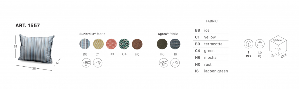 Мягкая декоративная подушка для кресла или дивана Lisa может бытьвыполнена из ткани sunbrella или из ткани Agora. В обоих случаях ткань обладает водоотталкивающими свойствами и стойкостьюк появлению пятен и плесени. Варианты цвета:можно выбрать из палитры. Посмотреть каталог обивок.Характеристики