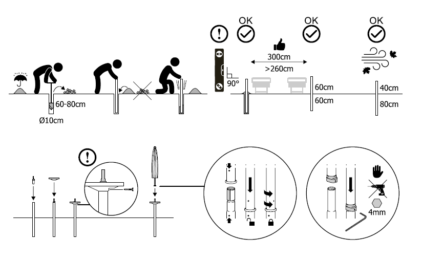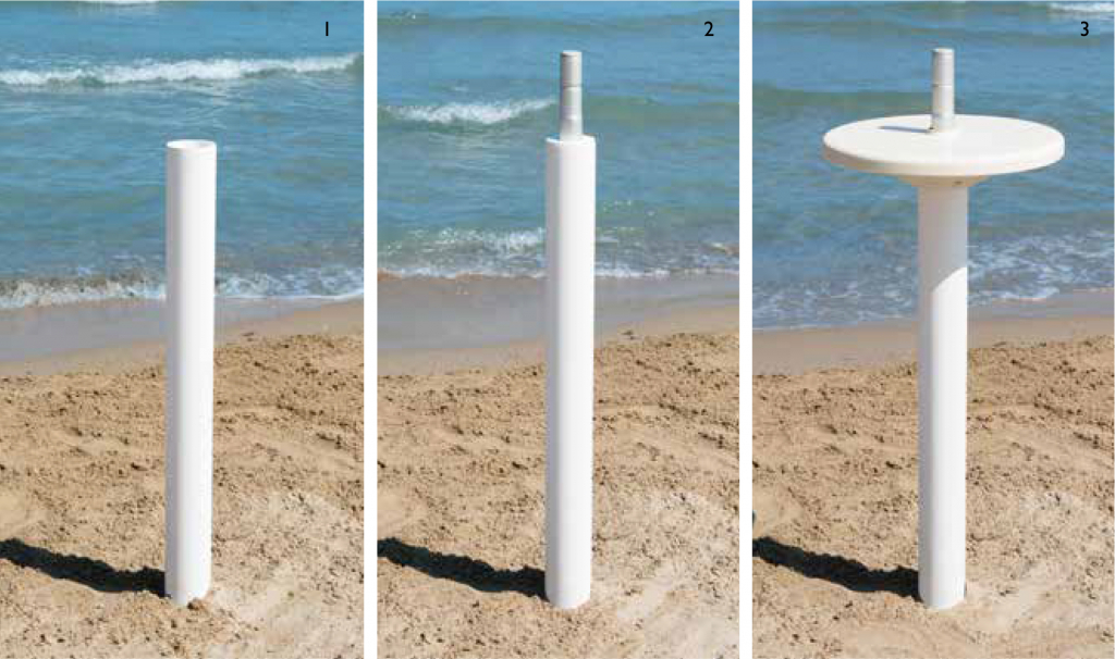 Опора со столиком для зонта Magnani Table, белый Столик для зонта устанавливается на опору. На него можно ставить стаканы с напитками, бутылки или графины с водой, положить телфон, очки, ключи или другие небольшие предметы. Состоит из комплекта опоры, устанавливаемой в песок (KIT FOR SAND COLUMN) - 3, разъема (CONNECTOR) - 2и столика (TABLE) - 1. Инструкция по установке: Вставьте разъем 2 в опору 3. Вставьте опору 3 в песок на глубину около 50 см. Поместите столик 1на опору 3, толкая его вниз, пока он не зафиксируется на месте.