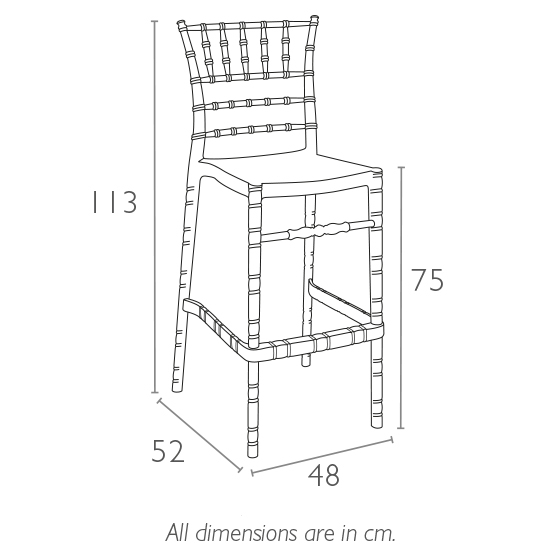 Пластиковый барный стул Chiavari выполнен из блестящего поликарбоната.Поликарбонат Makrolon® чрезвычайно прочный, легкий, со стеклянной прозрачностью и устойчив к ударам, в том числе при низких температурах.Благодаря использованию высококачественных материалов они долгое время не теряют своего привлекательного внешнего вида, даже несмотря на активную эксплуатацию. Продукция фабрики Siesta имеет европейский сертификат качества CATAS и предназначена для использования в общественных местах. Пластиковые барные стулья серии Chiavari станут отличным выбором для украшения свадебных церемоний, банкетов или любых других мероприятий. Благодаря отсутствию металлического каркаса и устойчивости к ультрафиолетовому воздействию барные стулья из пластика Chiavari можно использовать в том числе и на открытых пространствах. Особенности: изготовлен из высококачественного поликарбоната, устойчивого к царапинам; не имеет металлического каркаса - не ржавеет, не поддается коррозии; устойчив к ультрафиолету и атмосферным осадкам, выдерживает минусовую температуру до 20 градусов; штабелируемый - занимает минимум места при хранении; подходит для использования на открытом воздухе и в помещении; подушки для данной модели не выпускаются производителем. Открыть технические характеристики. Информация по уходу: прозрачные стулья можно протирать тряпкой из микрофибры, допускается применение нейтрального мыльного раствора. Запрещается использовать спиртосодержащие или ацетоносодержащие (а также им подобные) средства.Характеристики