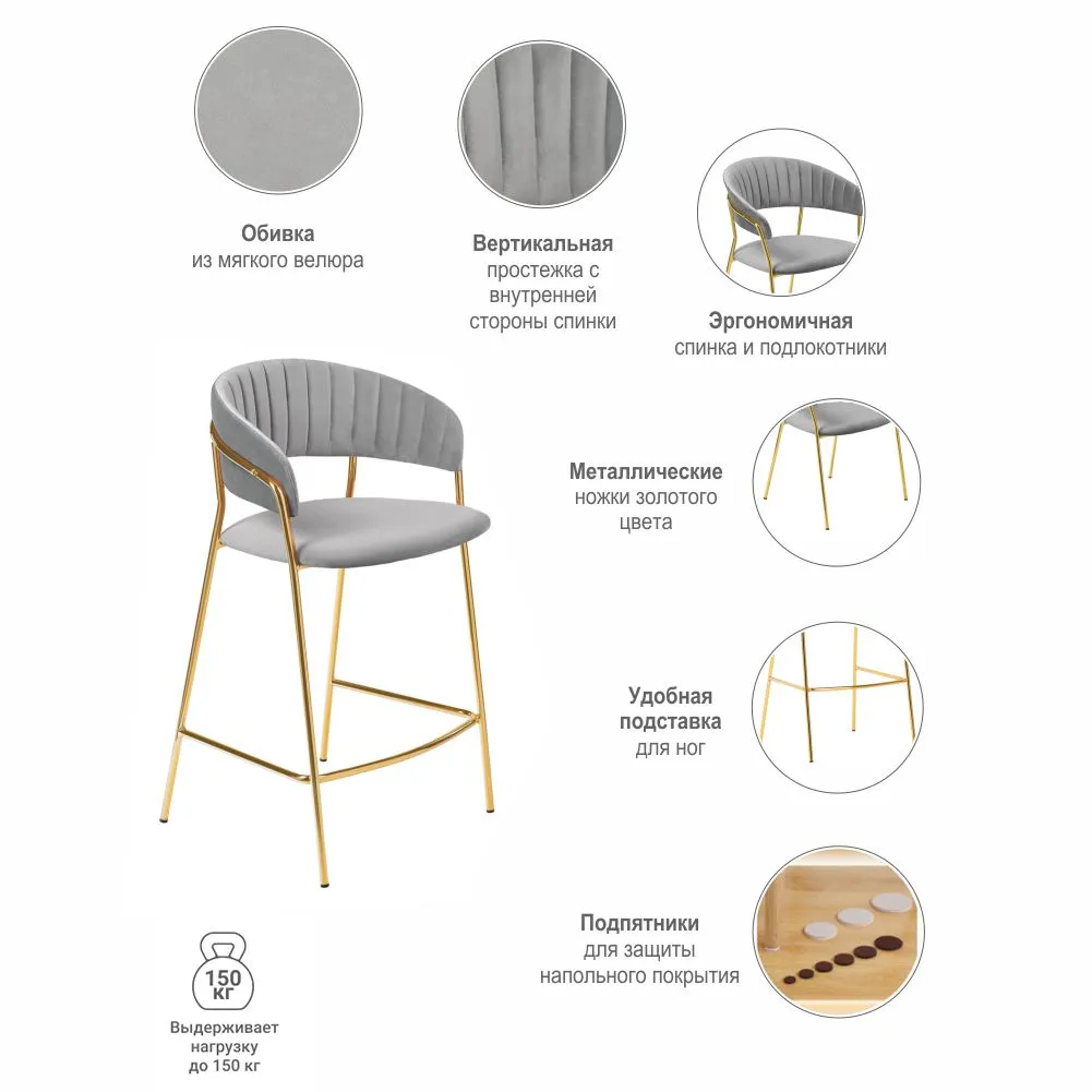Материал: фанера, пенополиуретан, велюр, сталь Материал обивки: велюр Материал ножек: сталь Цвет ножек: золото Размер: 52х52х92х65 см Вес: 6кг Максимальная нагрузка 150кг Поставляется в разобранном виде. В комплекте идёт инструкция и комплект аксессуаров для сборки.Характеристики