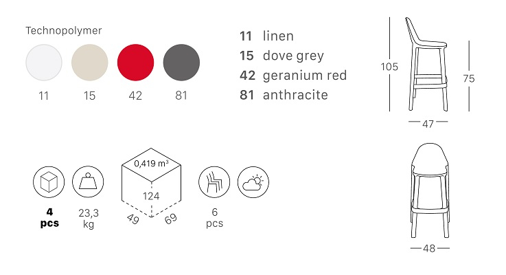 Пластиковый барный стул Piu из технополимера, армированного стекловолокном от дизайнеров Arter & Citton.Благодаря сдержанному внешнему виду, чистым линиям и комфорту, стул Piu полностью изготовлениз технополимера и идеально подходит для использования на открытом воздухе, как дома, так и на работе. Специальная форма ножек, выполненных в виде цельного блока, обеспечивает идеальную укладку в стек без зазоров,равномерноевыравниваниедеталей, исключительную устойчивость и минимально возможное пространстводля хранения. Особенности: Корпус выполнениз перерабатываемого технополимера, отлитого с помощью технологии воздушного формования и армированного стекловолокном. Возможность штабелирования до 6 шт. для максимального удобства хранения. Данная модель предназначенадля использования на летних площадках, террасах, фудкортах, а также во внутреннем интерьере кафе, ресторанов. Открыть технические характеристики.Характеристики