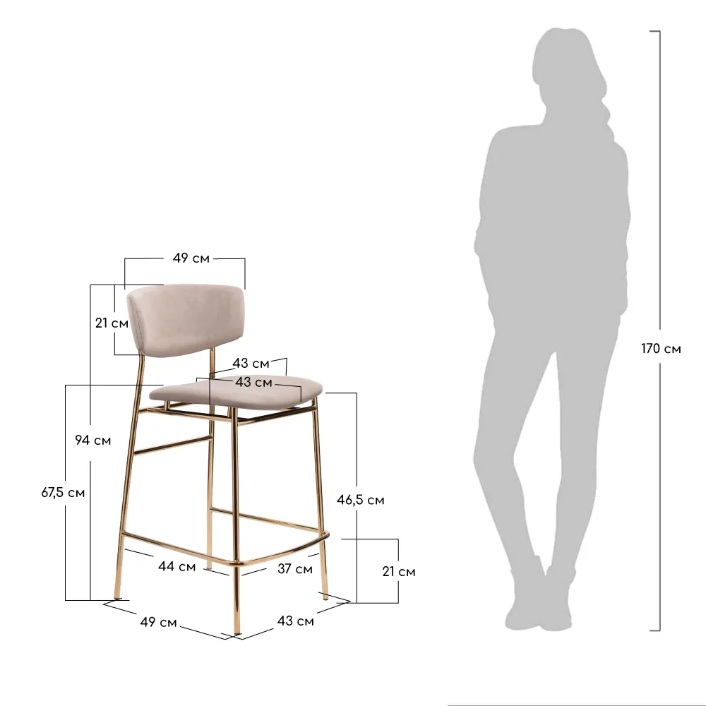 Материал сиденья: фанера, пенополиуретан, велюр. Материал опоры: нержавеющая сталь. Максимальная нагрузка 110 кг Длина: 43см Ширина: 49 см Высота: 94 см Высота сиденья: 67,5 см Масса: 6 кгВы можете купить Стул полубарный Bradex Home Elle латте с золотыми ножками оптом в нашем магазине, предложим цену с оптовой скидкой.