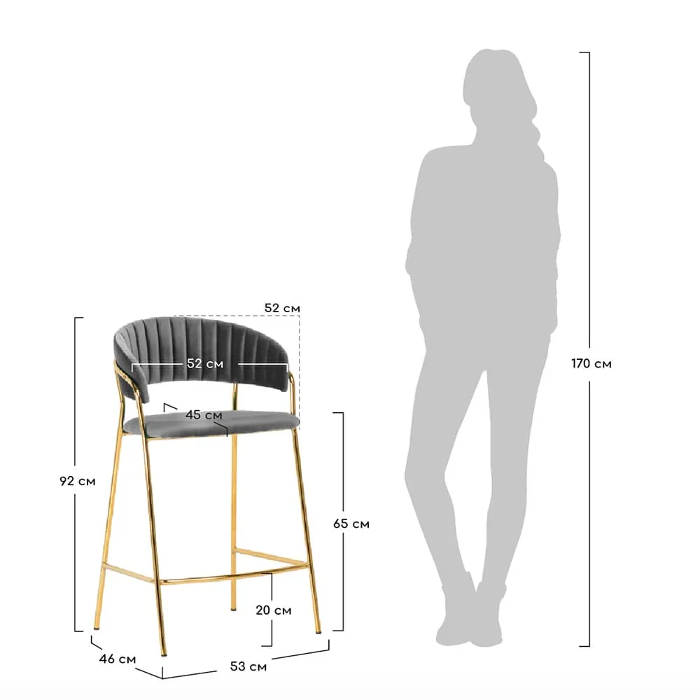 Материал: фанера, пенополиуретан, велюр, сталь Материал обивки: велюр Материал ножек: сталь Цвет ножек: золото Размер: 52х52х92х65 см Вес: 6кг Максимальная нагрузка 150кг Поставляется в разобранном виде. В комплекте идёт инструкция и комплект аксессуаров для сборки.Характеристики