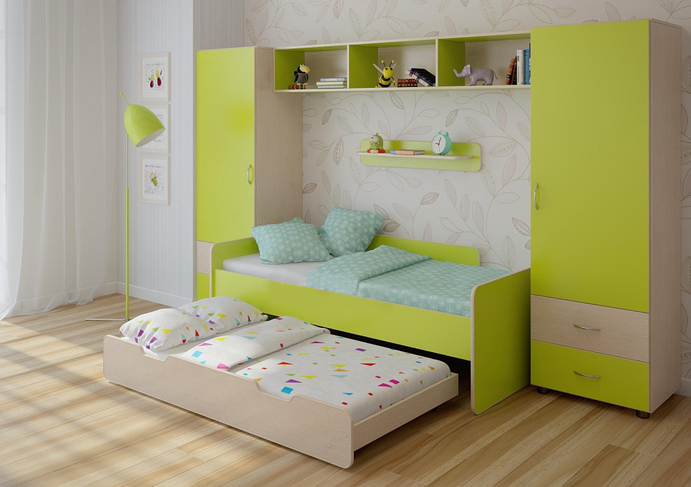 Недорогаядетская стенкаЛ-№16 - идеальна для двоих детей. Расцветки на любой вкус. В состав стенки входят: Классическая детская кровать с бортикомЛ-14со спальным местом1800 х 800. Удобно заправлять кровать,ребенку легко забираться и слезать,надёжно и практично.Высокие боковые бортикидля дополнительной безопасности спящего на верхней кровати.Приставной бортможно поставить как сзади,так и спереди кровати.Борт по центру кроватине даёт спящему ребенку упасть и в то же время остаётся место по бокам,чтобы слезть и залезть на кроватку. Выкатной ящик Л-03- Выдвижной ярус спроектирован таким образом,что может быть использован и какящик для хранения вещей,и как отдельное спальное место!Бортики ящика легко вмещают в себя матрас, что превращает ящик вполноценное спальное место 1600 х 800,которое при необходимости можно спрятать под кровать. Два пенала Л-О1- Компактные одностворчатые пеналы оснащены штангой для «плечиков» и полкой для головных уборов наверху,а внизу - двумя выкатными ящиками.В качестве опоры служат четыре ножки,снижающие вред для полового покрытия при перестановке.Вы можете выбрать пеналы как одинаковой,так и разных расцветок – подберите цвет вместе с детьми! Антресоль Л-02- Глубокая,вместительная полка-антресоль с тремя равными секциями замечательно подходит для упорядоченного хранения вещей. По Вашему выбору комплект может быть собран как на левую,так и на правую сторону.Характеристики