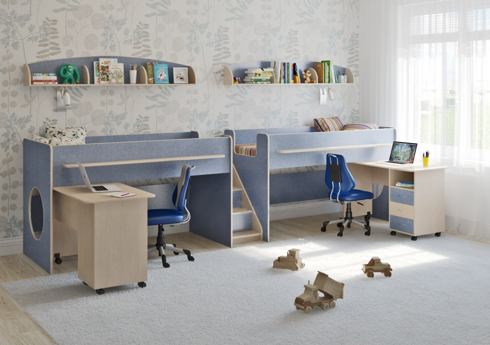 Детская стенка Л-№17 - удобный компактный комплект для двоих детей со столами. В комплект входит: Две детских кровати Л-23 со спальными местами 1800х800.Под спальным местом располагается игровая зона – свой уголок для ребенка. Высота кровати – 86см от пола, 105см вместе с бортиками. Родителям будет легко и удобно наблюдать за малышом,нетрудно заправлять кровать. Световое окно - дополнительное освещение,элемент для игры и возможность родителям наблюдать за ребенком.Длинная полочка на бортике – для хранения мелочей. Боковые бортики и мягкий противоударный кант – дополнительная безопасность для детей. Угловая лестница из трех ступенек одновременно выполняет функцию стеллажа.Стеллаж оснащен фасадами,таким образом каждая ступенька становится полноценной полкой с дверцей - дополнительное место для хранения. Две полочки Л-10 ,являющиеся в то же время и декоративными элементами. Стильный модуль разделен на три секции и имеет боковые ограничители,здесь удобно располагать приятные мелочи,книжки на ночь и другие вещи. Два комфортных письменных стола Л-03 ,оборудованных поворотными колесами.Столы легко перемещаются по полу,задвигаются и выдвигаются. Три выкатных ящика стола обеспечат удобное хранение канцелярии,письменных,учебных и прочих принадлежностей.Над ящиками открытая полка для мелочей,которые будут всегда под рукой. Для Вашего удобства во всех изделиях бортики спального места можно менять местами. По Вашему выбору комплект может быть собран как на левую, так и на правую сторону.Характеристики