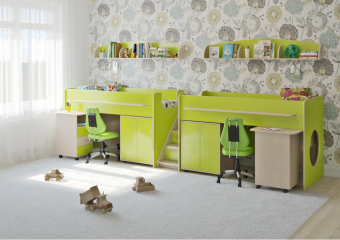 Детская стенка Л-№18 - замечательный комплект для двоих детей с рабочими местами. В комплект входит: Две детских кровати Л-23 со спальными местами 1800х800.Под спальным местом располагается игровая зона – свой уголок для ребенка.Высота кровати – 86см от пола,105см вместе с бортиками.Родителям будет легко и удобно наблюдать за малышом, нетрудно заправлять кровать. Световое окно - дополнительное освещение,элемент для игры и возможность родителям наблюдать за ребенком.Длинная полочка на бортике – для хранения мелочей. Боковые бортики и мягкий противоударный кант – дополнительная безопасность для детей. Угловая лестница из трех ступенек одновременно выполняет функцию стеллажа.Стеллаж оснащен фасадами,таким образом каждая ступенька становится полноценной полкой с дверцей - дополнительное место для хранения. Две полочки Л-10,являющиеся в то же время и декоративными элементами.Стильный модуль разделен на три секции и имеет боковые ограничители,здесь удобно располагать приятные мелочи,книжки на ночь и другие вещи. Две тумбы Л-02 с двумя дверцами и двумя полками внутри,которые отлично подходят для хранения игрушек или иных вещей.Легка в обращении,даже малыши смогут без труда доставать и убирать вещи. Два комфортных письменных стола Л-03,оборудованных поворотными колесами.Столы легко перемещаются по полу, задвигаются и выдвигаются.Три выкатных ящика стола обеспечат удобное хранение канцелярии,письменных,учебных и прочих принадлежностей.Над ящиками открытая полка для мелочей,которые будут всегда под рукой. Для Вашего удобства во всех изделиях бортики спального места можно менять местами. По Вашему выбору комплект может быть собран как на левую,так и на правую сторону.Характеристики