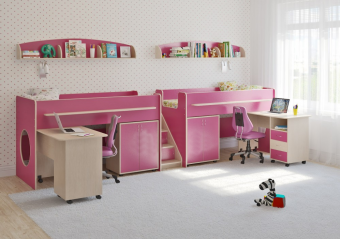Детская стенка Л-№18 - замечательный комплект для двоих детей с рабочими местами. В комплект входит: Две детских кровати Л-23 со спальными местами 1800х800.Под спальным местом располагается игровая зона – свой уголок для ребенка.Высота кровати – 86см от пола,105см вместе с бортиками.Родителям будет легко и удобно наблюдать за малышом, нетрудно заправлять кровать. Световое окно - дополнительное освещение,элемент для игры и возможность родителям наблюдать за ребенком.Длинная полочка на бортике – для хранения мелочей. Боковые бортики и мягкий противоударный кант – дополнительная безопасность для детей. Угловая лестница из трех ступенек одновременно выполняет функцию стеллажа.Стеллаж оснащен фасадами,таким образом каждая ступенька становится полноценной полкой с дверцей - дополнительное место для хранения. Две полочки Л-10,являющиеся в то же время и декоративными элементами.Стильный модуль разделен на три секции и имеет боковые ограничители,здесь удобно располагать приятные мелочи,книжки на ночь и другие вещи. Две тумбы Л-02 с двумя дверцами и двумя полками внутри,которые отлично подходят для хранения игрушек или иных вещей.Легка в обращении,даже малыши смогут без труда доставать и убирать вещи. Два комфортных письменных стола Л-03,оборудованных поворотными колесами.Столы легко перемещаются по полу, задвигаются и выдвигаются.Три выкатных ящика стола обеспечат удобное хранение канцелярии,письменных,учебных и прочих принадлежностей.Над ящиками открытая полка для мелочей,которые будут всегда под рукой. Для Вашего удобства во всех изделиях бортики спального места можно менять местами. По Вашему выбору комплект может быть собран как на левую,так и на правую сторону.Характеристики