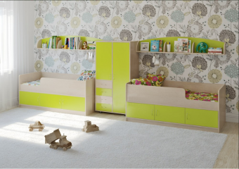 Детская стенкаЛ-№19 - стильный и компактный комплект для двоих детей. Состав комплекта: Две кроватиЛ-35со спальным местом1600х700. Кровать имеет высокийзащитный бортики в то же время низкий проём.Ребенку легко залезать и слезать,а во время сна он надежно защищенбортиком с максимальной высотой 29см. Под спальным местом располагаются3 полки с дверцами.Вместительные полки отлично подойдут для хранения постельного белья,вещей,принадлежностей,игрушек.Дверцы формируют законченный образ,помогая содержать вещи в порядке и защищая содержимое от пыли. Элегантный двустворчатый шкаф,в котором есть всё необходимое.Шкаф Л-03условно делится на три зоны - одна зона с двумя полками и со штангой для «плечиков»,вторая с тремя полками,и третья - четыре выкатных ящика. Таким образом,Вы сможете распределить вшкафу Л-03любые вещи и максимально удобно организовать хранение.В качестве опоры служат четыре ножки,снижающие вред для напольного покрытия при перестановке. Две полочки Л-09,являющиеся в то же время и декоративными элементами.Стильный модульразделен на три секции и имеет боковые ограничители,здесь удобно располагать приятные мелочи, книжки на ночь и другие вещи. Мягкий противоударный кант– дополнительная безопасность для детей.Характеристики