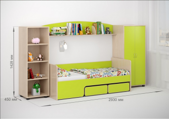 Детская стенкаЛ-№24- большой набор мебели по доступной цене. Простойминималистский дизайн и в то же время вместительность и практичностьделаютстеллаж Л-02незаменимым элементом детской комнаты.Включая специальные устойчивые ножки,высота стеллажа составляет всего 143см,а значит, ребенку будет удобно самостоятельно наводить порядок и раскладывать вещи в четырех полках для хранения. Двустворчатый шкаф Л-02,внутри которого однобольшое отделение со штангой для «плечиков» и двумя полками,занимает почётное место в этом комплекте.Здесь можно хранить одежду,белье,иные личные вещи – места для всего хватит. Стеллаж и шкафсоединены между собойполкой Л-07и представляютединую мебельную систему.Полка разделена на три секции,на ней удобно располагать приятные сердце мелочи,книжки на ночь и другие вещицы. Между шкафом и стеллажом,под полкой располагается центральная часть комплекта -детская кровать Л-40– это удивительнаякровать-трансформер,которая имеетчетыре варианта сборки!В набор также входитбортик Л-02. Таким образом,собрав кровать вварианте «диванчик»,оснастите кроватьбортиком – получится стильная и безопасная модель! В комплект входятдва удобных ящика на колёсиках.Ящики легко закатываются и выкатываются,с этим без труда справится ребенок. Отличные помощники в решение вопроса хранения игрушек и других вещей.Ящики идеально помещаются под фигурный бортик. Мягкий противоударный кант– дополнительная безопасность для детей. По Вашему выбору комплект может быть собран как на левую,так и на правую сторону.Характеристики