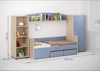 Детская стенкаЛ-№24- большой набор мебели по доступной цене. Простойминималистский дизайн и в то же время вместительность и практичностьделаютстеллаж Л-02незаменимым элементом детской комнаты.Включая специальные устойчивые ножки,высота стеллажа составляет всего 143см,а значит, ребенку будет удобно самостоятельно наводить порядок и раскладывать вещи в четырех полках для хранения. Двустворчатый шкаф Л-02,внутри которого однобольшое отделение со штангой для «плечиков» и двумя полками,занимает почётное место в этом комплекте.Здесь можно хранить одежду,белье,иные личные вещи – места для всего хватит. Стеллаж и шкафсоединены между собойполкой Л-07и представляютединую мебельную систему.Полка разделена на три секции,на ней удобно располагать приятные сердце мелочи,книжки на ночь и другие вещицы. Между шкафом и стеллажом,под полкой располагается центральная часть комплекта -детская кровать Л-40– это удивительнаякровать-трансформер,которая имеетчетыре варианта сборки!В набор также входитбортик Л-02. Таким образом,собрав кровать вварианте «диванчик»,оснастите кроватьбортиком – получится стильная и безопасная модель! В комплект входятдва удобных ящика на колёсиках.Ящики легко закатываются и выкатываются,с этим без труда справится ребенок. Отличные помощники в решение вопроса хранения игрушек и других вещей.Ящики идеально помещаются под фигурный бортик. Мягкий противоударный кант– дополнительная безопасность для детей. По Вашему выбору комплект может быть собран как на левую,так и на правую сторону.Характеристики