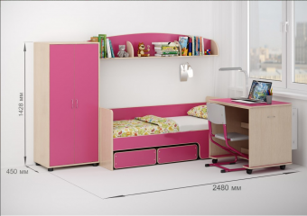 Детская стенкаЛ-№26- большой комплект детской мебели -кровать,шкаф,стол и полка! Детская комната готова! В комплект входят: Двустворчатый шкаф Л-02,внутри которого однобольшое отделение со штангой для «плечиков» и двумя полками,занимает почётное место в этом комплекте.Здесь можно хранить одежду,белье,иные личные вещи – места для всего хватит. Детская кроватьЛ-40- это удивительнаякровать-трансформер,которая имеетчетыре варианта сборки!. В комплект входятдва удобных ящика на колёсиках.Ящики легко закатываются и выкатываются,с этим без труда справится ребенок. Отличные помощники в решение вопроса хранения игрушек и других вещей.Ящики идеально помещаются под фигурный бортик. Практичный стол Л-02 c колёсиками,легко перемещается по полу,задвигается и выдвигается.На боковом борту присутствует ручка для более комфортного перемещения столика. Конструкция столапозволяет малышам играть в «домик»,адве дополнительные внутренние полочки с бортикамимогут служить как для хранения канцелярских принадлежностей,так и для хранения игрушек. Полка Л-10- стильный модуль,который отлично подходит для расположения над кроватьюсо спальными местом длиной 1800. Полка разделена натри секции и имеет боковые ограничители,на ней удобно располагать приятные сердце мелочи,книжки на ночь и другие вещицы. Мягкий противоударный кант– дополнительная безопасность для детей. По Вашему выбору комплект может быть собран как на левую,так и на правую сторону.Характеристики