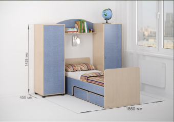 Детская стенкаЛ-№27- комплект детской мебели свизуальным делением комнаты на зоныблагодаряперпендикулярному расположению кровати. Простойминималистский дизайни в то же времявместительность и практичностьделаютпенал Л-02незаменимым элементом детской комнаты. Вашему ребенку будет удобно самостоятельно наводить порядок и раскладывать вещи вчетырех полках для хранения. Пенал Л-03,внутри которого однобольшое отделение со штангой для «плечиков» и двумя полками,занимает почётное место в этом комплекте.Здесь можно хранить одежду,белье,иные личные вещи –места для всего хватит. Между пеналами располагается центральная часть комплекта -детская кровать Л-40.Кроватьидеально вписывается в пространство под полкой,Вам остается лишь решить,на какую сторону установить борт,а на какую ребенок будет слезать к кровати. Это удивительнаякровать - трансформер,которая имеетчетыре варианта сборки!В комплект входятдва удобных ящика на колёсиках.Ящики легко закатываются и выкатываются,с этим без труда справится ребенок. Отличные помощники в решение вопроса хранения игрушек и других вещей.Ящикиидеально помещаются под фигурный бортик. Мягкий противоударный кант– дополнительная безопасность для детей. По Вашему выбору комплект может быть собран как на левую,так и на правую сторону.Характеристики