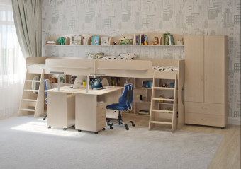 Детская стенкаЛ-№30- замечательныйвместительный комплект для двоих детей! В комплект входит: Элегантный в своей простоте шкаф, в котором всё есть - и нет ничего лишнего. Шкаф является двустворчатым, внутри две зоны:с пятью полками и со штангой для «плечиков». Над штангой также располагается полка для головных уборов. Внизу шкаф оборудовандвумя выкатными ящиками. В качестве опоры служат четыре ножки, снижающие вред для полового покрытия при перестановке. Две полочки Л-10,являющиеся в то же время и декоративными элементами. Стильный модульразделен на три секции и имеет боковые ограничители, здесь удобно располагать приятные мелочи, книжки на ночь и другие вещи. Две кровати с большим спальным местом 1800х800. Маленькая полочка на верхнем бортике удобна для мелочей. Под спальным местом располагаетсяигровая зона– свой уголок для ребенка. Вигровой зонерасполагаетсястеллаж, отлично подходящий для хранения игрушек. Стеллаж состоит из трех уровней, верхний и нижний уровни разделены на 3 секции, а средний – на 2.Итого 8 секций – удобно для поддержания порядка и сортировки предметов. Световые окна- дополнительное освещение, элемент для игры и возможность родителям наблюдать за ребенком. В этой модели совсемнет острых углов!Все линии плавные, что не только выглядит красиво и современно, но и обеспечивает еще больше безопасности. Две устойчивых лестницы из массива сосны– четыре широких удобных ступеньки, хороший безопасный наклон. Мягкий противоударный кант– дополнительная безопасность для детей. По вашему выбору комплект может быть собран как на левую, так и на правую сторону.Характеристики