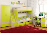Детская стенка с двухъярусной кроватью Л-№10 – идеальна для семьи с двумя детьми. Десять вариантов расцветокна любой вкус. В состав стенки входят: Детская двухъярусная кровать Л-10- классическаядвухъярусная кроватьсо встроенной двухсекционной полкой оборудованадвумя вместительными ящиками с колёсикамидля организации хранения игрушек,белья или иных вещей. Угловая лестница-стеллаж ЛУ-10из четырех ступенек надёжна и безопасна.В комплект входят фасады,поэтому стеллаж состоит из трёх полноценных полок с дверками - удобное дополнительное место для хранения вещей. Шкаф Л-01элегантен в своей простоте.Двустворчатый,внутри две зоны - с пятью полками и со штангой для «плечиков».Сверху полка для головных уборов,внизу два ящика. Стол Л-01удобный письменный стол для занятий оборудован колёсиками,имеет три выкатных ящика для хранения принадлежностей,а также есть отсек для системного блока компьютера и выкатная полка для клавиатуры. Полка Л-01– небольшая удобная полочка с закругленными краями. Модель универсальна - сторона определяется при сборке. Матрасы в комплект не входят - приобретаются отдельно.Характеристики