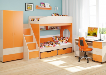 Детская стенка с двухъярусной кроватью Л-№10 – идеальна для семьи с двумя детьми. Десять вариантов расцветокна любой вкус. В состав стенки входят: Детская двухъярусная кровать Л-10- классическаядвухъярусная кроватьсо встроенной двухсекционной полкой оборудованадвумя вместительными ящиками с колёсикамидля организации хранения игрушек,белья или иных вещей. Угловая лестница-стеллаж ЛУ-10из четырех ступенек надёжна и безопасна.В комплект входят фасады,поэтому стеллаж состоит из трёх полноценных полок с дверками - удобное дополнительное место для хранения вещей. Шкаф Л-01элегантен в своей простоте.Двустворчатый,внутри две зоны - с пятью полками и со штангой для «плечиков».Сверху полка для головных уборов,внизу два ящика. Стол Л-01удобный письменный стол для занятий оборудован колёсиками,имеет три выкатных ящика для хранения принадлежностей,а также есть отсек для системного блока компьютера и выкатная полка для клавиатуры. Полка Л-01– небольшая удобная полочка с закругленными краями. Модель универсальна - сторона определяется при сборке. Матрасы в комплект не входят - приобретаются отдельно.Характеристики