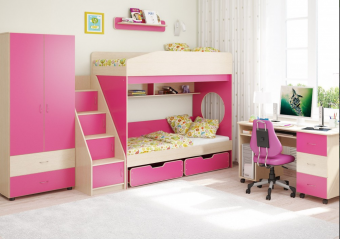 Детская стенка с двухъярусной кроватью Л-№10 – идеальна для семьи с двумя детьми. Десять вариантов расцветокна любой вкус. В состав стенки входят: Детская двухъярусная кровать Л-10- классическаядвухъярусная кроватьсо встроенной двухсекционной полкой оборудованадвумя вместительными ящиками с колёсикамидля организации хранения игрушек,белья или иных вещей. Угловая лестница-стеллаж ЛУ-10из четырех ступенек надёжна и безопасна.В комплект входят фасады,поэтому стеллаж состоит из трёх полноценных полок с дверками - удобное дополнительное место для хранения вещей. Шкаф Л-01элегантен в своей простоте.Двустворчатый,внутри две зоны - с пятью полками и со штангой для «плечиков».Сверху полка для головных уборов,внизу два ящика. Стол Л-01удобный письменный стол для занятий оборудован колёсиками,имеет три выкатных ящика для хранения принадлежностей,а также есть отсек для системного блока компьютера и выкатная полка для клавиатуры. Полка Л-01– небольшая удобная полочка с закругленными краями. Модель универсальна - сторона определяется при сборке. Матрасы в комплект не входят - приобретаются отдельно.Характеристики
