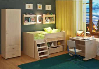 Кровать детская Л-6 Удобно заправлять кровать, ребенку легко забираться и слезать, надёжно и практично. Лестница из массива сосны – широкая, устойчивая и надёжная.Под спальным местом располагаются три вместительных ниши для игрушек или иных принадлежностей.В комплект входит ящик ,который удобно выкатывается и закатывается,так как оборудован колёсиками.Полка на боковом бортике для хранения мелочей. Практичный стол Л-02 с колёсиками легко перемещается по полу.Отлично помещается под спальным местом кровати,задвигается и выдвигается.На боковом борту присутствует ручка для более комфортного перемещения столика.Конструкция стола позволяет малышам играть в «домик»,а две дополнительные внутренние полочки с бортиками могут служить как для хранения канцелярских принадлежностей,так и для хранения игрушек. Компактный одностворчатый пенал Л-01 отлично впишется в узкое пространство.Внутри пенала расположена штанга для «плечиков» и полка для головных уборов.Внизу пенал оборудован двумя выкатными ящиками. Полка Л-01 - Минималистский дизайн, закругленные края и мягкий противоударный кант – лучшее дополнение кровати-чердака. Полка Л-02 - Оригинальная двухъярусная полка подойдет для хранения как небольших, так и высоких предметов.Дополнительный бортик защищает содержимое полки от падений. Модель универсальна - сторона определяется при сборке. Матрасы в комплект не входят - приобретаются отдельно.Характеристики