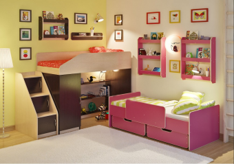 Детская стенкаЛ-№13 – уют и порядок для двоих детей. В состав стенки входят: Kровать чердак Л-11- Внизу расположенаигровая зонасо стеллажом для игрушек.В кровать встроенвместительныйшкафс четырьмя полками и штангой для хранения одежды,белья,игрушек или иных вещей. Угловая лестница-стеллаж ЛУ-10из четырех ступенек оборудована фасадами,поэтому стеллаж состоит из трёх полноценных полок с дверками. Kровать детская Л-14с приставным бортом.Удобно заправлять кровать.Боковые бортики и мягкий противоударный кантдают дополнительную защиту для ребенка. Ящик выкатной Л-01(2шт) - Два ящика идеально помещаются под кроватьЛ-14,удобно выкатываются и закатываются,так как оборудованы колёсиками. Полка Л-01- Минималистский дизайн,закругленные края и мягкий противоударный кант – лучшее дополнение кровати-чердака. Полка Л-02- Оригинальная двухъярусная полка подойдет для хранения как небольших,так и высоких предметов.Дополнительный бортикзащищает содержимое полки от падений. Полка Л-03(2 шт) -Две полки с тремя ярусами– отличное решение для хранения множества вещей.Хранимые предметы располагаются на стене,поэтомупространство для хранения увеличивается без ущерба для свободной площади.Каждый ярус оборудован бортиком,который защищает содержимое полки от падений. Модель универсальна - сторона определяется при сборке. Матрасы в комплект не входят - приобретаются отдельно.Характеристики