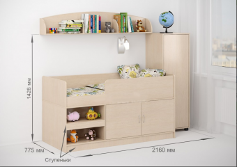 Детская стенкаЛ-№22- простота,вместительность и функциональность по удивительно невысокой цене! Этот комплект составляюткровать,полка и пенал. Высота кроватиЛ-39 всего 87см- удобно заправлять,а также ребенок без труда будет забираться на кровать.Под спальным местом располагаетсявстроенный шкафчик – две широкие полки,закрывающиеся на две дверцы. Отлично подходят для хранения белья,игрушек или иных вещей.При этом закрытые дверцы оберегают вещи от пыли и помогают поддерживать чистоту и порядок. Рядом располагаютсядве открытые полки,которые одновременно выполняют роль ступенек.При этомшаг между ступеньками всего 35см,что обеспечивает безопасный подъем и спуск с кровати. Пенал Л-03,внутри которого отделение соштангой для «плечиков» и одной полкой внизу,занимает почётное место в этом комплекте.Здесь можно хранить одежду,белье,иные личные вещи. Полка Л-09представляет собой два в одном -полку и декоративный элемент.Разделена на три секции и имеет боковые ограничители,на ней удобно располагать приятные мелочи,книжки на ночь и другие вещи. Комплект представлен впяти вариантах расцветок,Вы легко подберёте подходящий к дизайну Вашей комнаты. Мягкий противоударный кант– дополнительная безопасность для детей. Модель универсальна - сторона определяется при сборке. Матрасы в комплект не входят - приобретаются отдельно.Характеристики