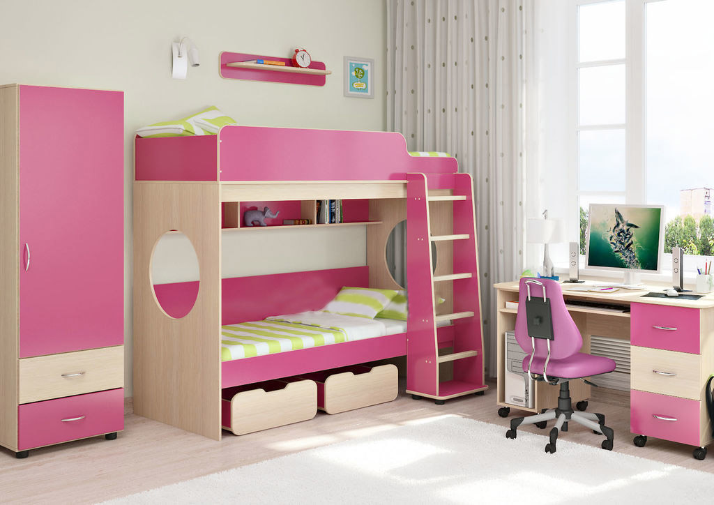 Г отовая комната для Вашего ребенка, которая совмещает в себе спальное место, вместительное место для одежды, выдвижной стол и игровую зону. Большое количество оттенков помогут подобрать мебель по вкусу ребенку и интерьеру комнаты, а большое разнообразие комплектаций и размеров поможет вписать детскую комнату даже в любую малогабаритную квартиру. Кровать детская двухъярусная Л-7 – классическая двухъярусная кровать с двумя параллельными кроватями, трехсекционной полкой, двумя вместительными ящиками и световым окном. Лестница прямая ЛП-04 из массива сосны – устойчивая и надёжная. Стол Л-01 - удобный письменный стол для занятий оборудован колёсиками, имеет три выкатных ящика для хранения принадлежностей, а также есть отсек для системного блока компьютера и выкатная полка для клавиатуры. пенал Л-01. Компактный одностворчатый пенал со штангой для «плечиков» и полкой для головных уборов. полка Л-01 – небольшая удобная полочка с закругленными краями Модель универсальна - сторона определяется при сборке. Матрасы в комплект не входят - приобретаются отдельно.Характеристики