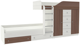 Неординарная и яркая двухъярусная кровать Астра 6 создана специально для того, чтобы стать стильным, функциональным элементом мебели для детской комнаты, которая рассчитана для двоих детей. Конструкция делится на два яруса, но благодаря необычному дизайнерскому решению ни одно из спальных мест не находится в тени другого. Верхний ярус оснащен специальным прочным защитным бортом по периметру для безопасного сна ребенка. Второе спальное место находится немного впереди, пространство под верхней кроватью занимает комод с выдвижными ящиками и два одностворчатых шкафа. На уровне пола также можно найти несколько вместительных ящиков. Модель универсальна - сторона определяется при сборке. Матрасы в комплект не входят - приобретаются отдельно.Характеристики
