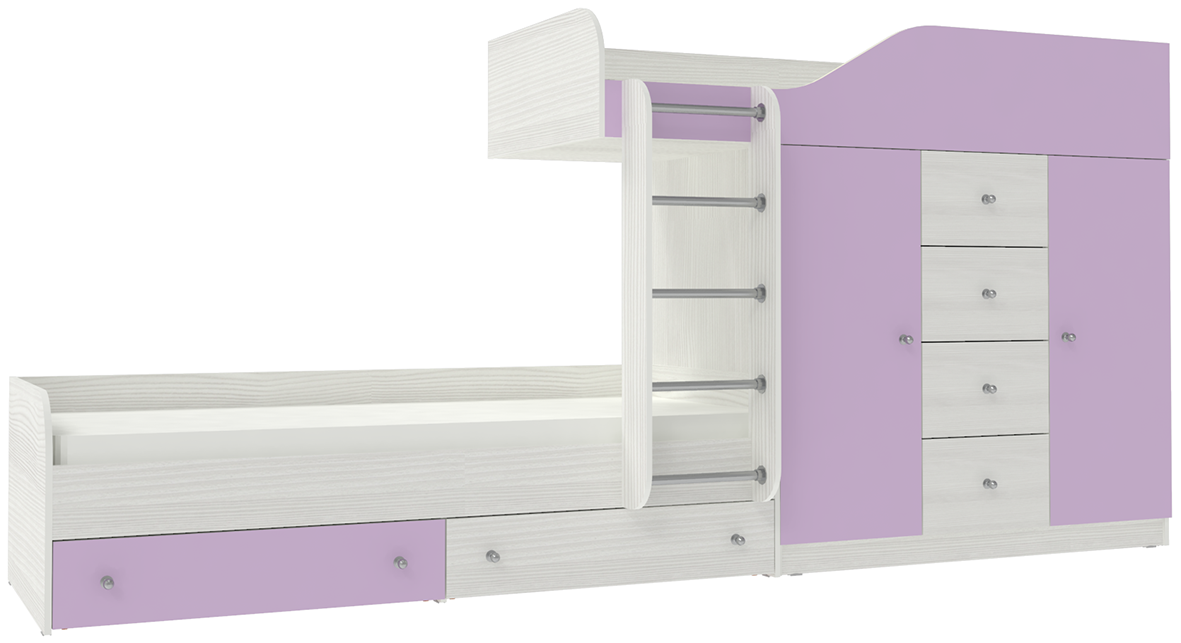 Неординарная и яркая двухъярусная кровать Астра 6 создана специально для того, чтобы стать стильным, функциональным элементом мебели для детской комнаты, которая рассчитана для двоих детей. Конструкция делится на два яруса, но благодаря необычному дизайнерскому решению ни одно из спальных мест не находится в тени другого. Верхний ярус оснащен специальным прочным защитным бортом по периметру для безопасного сна ребенка. Второе спальное место находится немного впереди, пространство под верхней кроватью занимает комод с выдвижными ящиками и два одностворчатых шкафа. На уровне пола также можно найти несколько вместительных ящиков. Модель универсальна - сторона определяется при сборке. Матрасы в комплект не входят - приобретаются отдельно.Характеристики