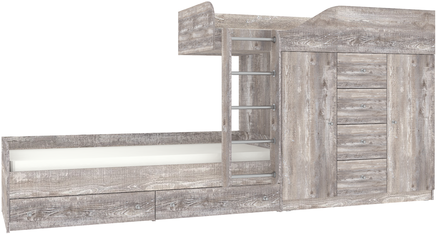 Неординарная и яркая двухъярусная кровать Астра 6 создана специально для того, чтобы стать стильным, функциональным элементом мебели для детской комнаты, которая рассчитана для двоих детей. Конструкция делится на два яруса, но благодаря необычному дизайнерскому решению ни одно из спальных мест не находится в тени другого. Верхний ярус оснащен специальным прочным защитным бортом по периметру для безопасного сна ребенка. Второе спальное место находится немного впереди, пространство под верхней кроватью занимает комод с выдвижными ящиками и два одностворчатых шкафа. На уровне пола также можно найти несколько вместительных ящиков. Модель универсальна - сторона определяется при сборке. Матрасы в комплект не входят - приобретаются отдельно.Характеристики
