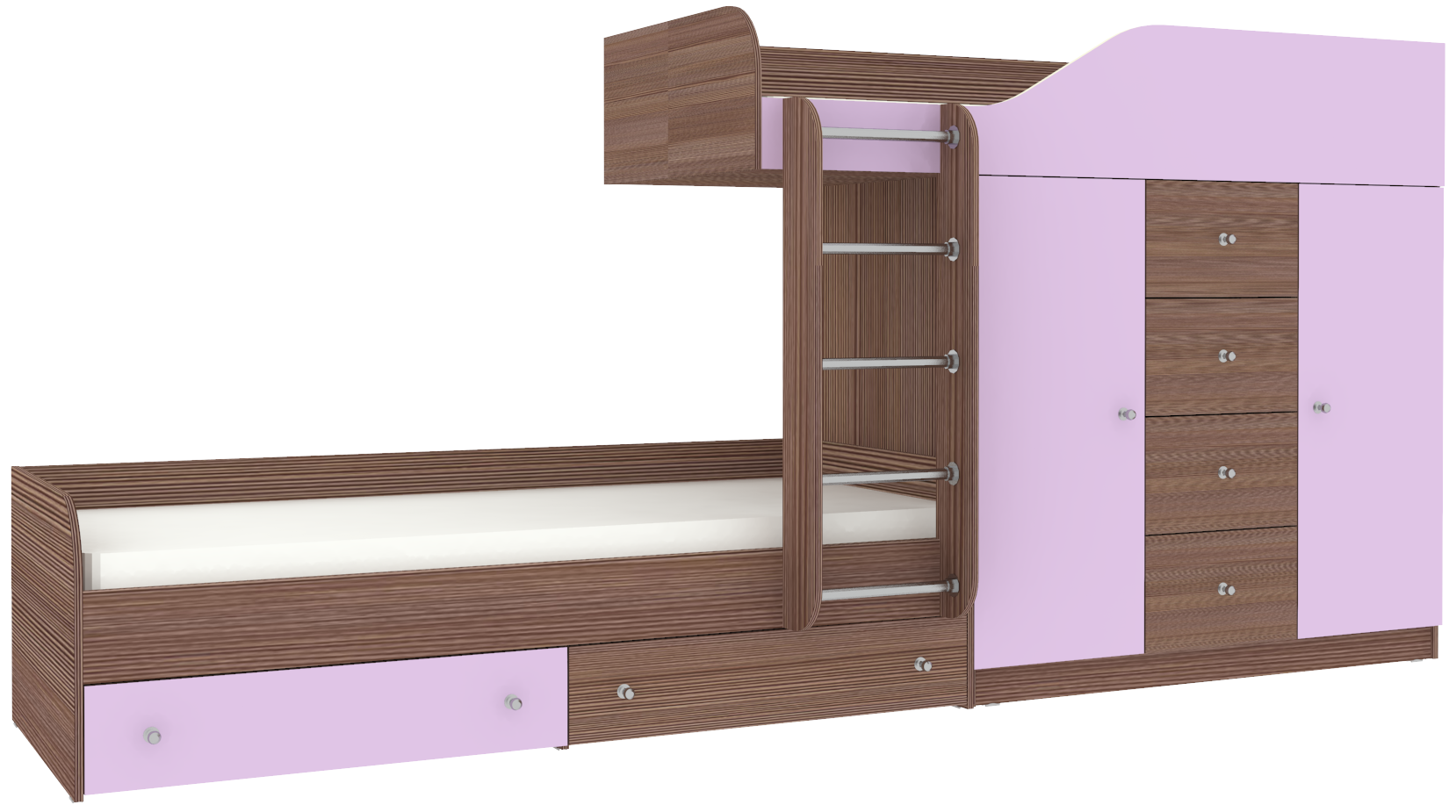 Неординарная и яркая двухъярусная кровать Астра 6 создана специально для того, чтобы стать стильным, функциональным элементом мебели для детской комнаты, которая рассчитана для двоих детей. Конструкция делится на два яруса, но благодаря необычному дизайнерскому решению ни одно из спальных мест не находится в тени другого. Верхний ярус оснащен специальным прочным защитным бортом по периметру для безопасного сна ребенка. Второе спальное место находится немного впереди, пространство под верхней кроватью занимает комод с выдвижными ящиками и два одностворчатых шкафа. На уровне пола также можно найти несколько вместительных ящиков. Модель универсальна - сторона определяется при сборке. Матрасы в комплект не входят - приобретаются отдельно.Характеристики