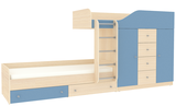 Неординарная и яркая двухъярусная кровать Астра 6 создана специально для того, чтобы стать стильным, функциональным элементом мебели для детской комнаты, которая рассчитана для двоих детей. Конструкция делится на два яруса, но благодаря необычному дизайнерскому решению ни одно из спальных мест не находится в тени другого. Верхний ярус оснащен специальным прочным защитным бортом по периметру для безопасного сна ребенка. Второе спальное место находится немного впереди, пространство под верхней кроватью занимает комод с выдвижными ящиками и два одностворчатых шкафа. На уровне пола также можно найти несколько вместительных ящиков. Модель универсальна - сторона определяется при сборке. Матрасы в комплект не входят - приобретаются отдельно.Характеристики