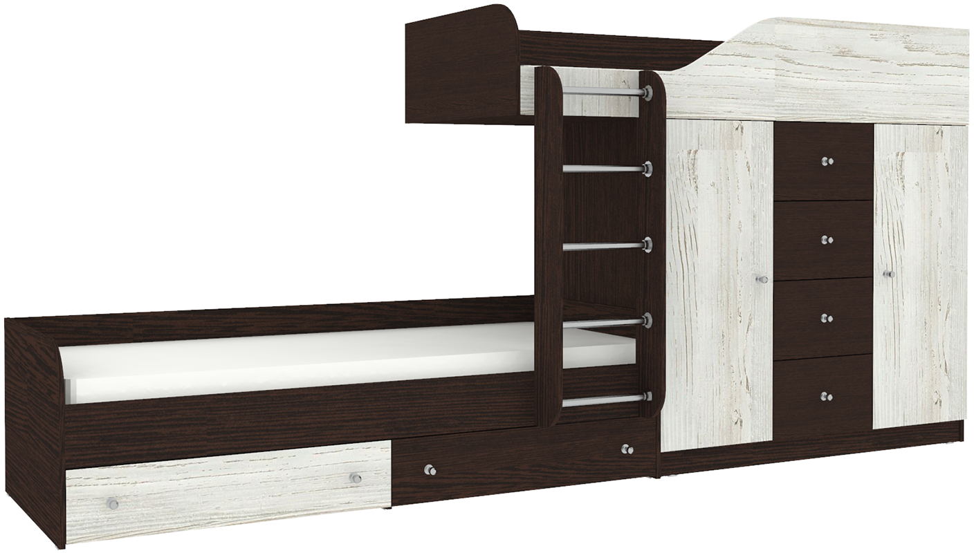 Неординарная и яркая двухъярусная кровать Астра 6 создана специально для того, чтобы стать стильным, функциональным элементом мебели для детской комнаты, которая рассчитана для двоих детей. Конструкция делится на два яруса, но благодаря необычному дизайнерскому решению ни одно из спальных мест не находится в тени другого. Верхний ярус оснащен специальным прочным защитным бортом по периметру для безопасного сна ребенка. Второе спальное место находится немного впереди, пространство под верхней кроватью занимает комод с выдвижными ящиками и два одностворчатых шкафа. На уровне пола также можно найти несколько вместительных ящиков. Модель универсальна - сторона определяется при сборке. Матрасы в комплект не входят - приобретаются отдельно.Характеристики