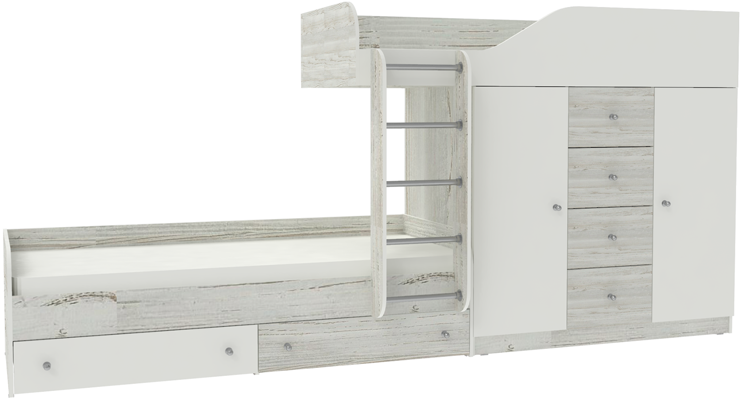 Неординарная и яркая двухъярусная кровать Астра 6 создана специально для того, чтобы стать стильным, функциональным элементом мебели для детской комнаты, которая рассчитана для двоих детей. Конструкция делится на два яруса, но благодаря необычному дизайнерскому решению ни одно из спальных мест не находится в тени другого. Верхний ярус оснащен специальным прочным защитным бортом по периметру для безопасного сна ребенка. Второе спальное место находится немного впереди, пространство под верхней кроватью занимает комод с выдвижными ящиками и два одностворчатых шкафа. На уровне пола также можно найти несколько вместительных ящиков. Модель универсальна - сторона определяется при сборке. Матрасы в комплект не входят - приобретаются отдельно.Характеристики