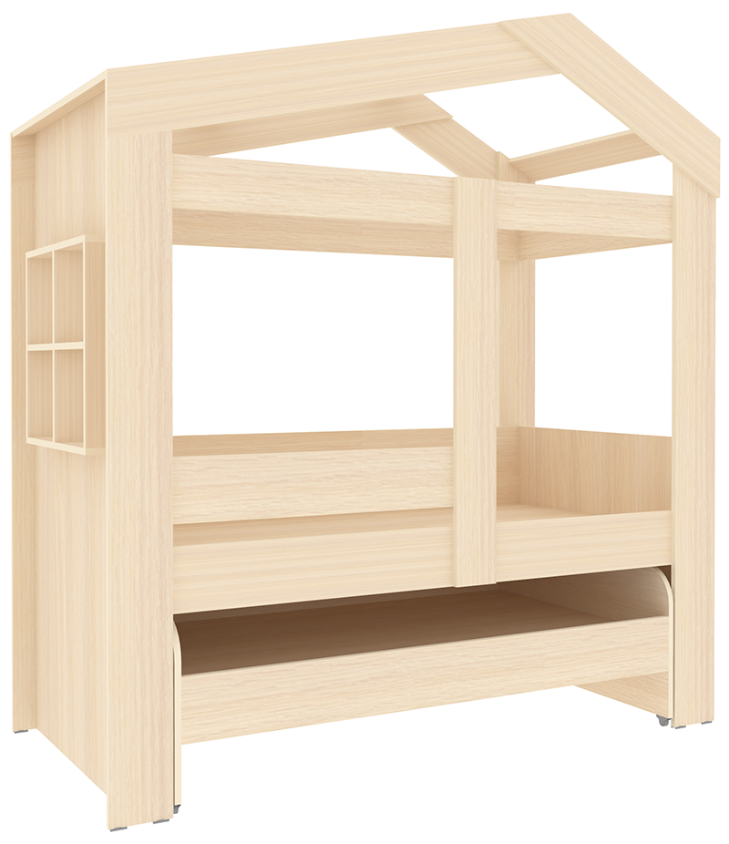 Практичность в детской комнате: кровать-домик Сказка для двоих детей, которая не занимает много места. Кровать состоит из двух частей: верхней кровати ДС-36.1 в виде домика с окошком (спальное место 160х80 см). И нижней выкатной кровати ДС-36.2 (спальное место 140х80 см). Нижняя выкатная кровать на колесиках, полностью убирается в специальную нишу под верхней кроватью и не занимает много места. Также ее можно поставить отдельно и использовать как самостоятельный модуль для сна. Верхняя кровать имеет крышу в виде домика и декоративное окошко на боковине. Дополнительно можно приобрести тумбу-лестницу для удобного подъема иВыкатной ящик. Подберите наиболее подходящее Вам цветовое решение. Все цветные детали со светло-бежевой кромкой. Дополнительно к комплекту можно приобрести - нижний выкатной ящик для белья под выдвижную кровать, лестницу-комод, матрасы.