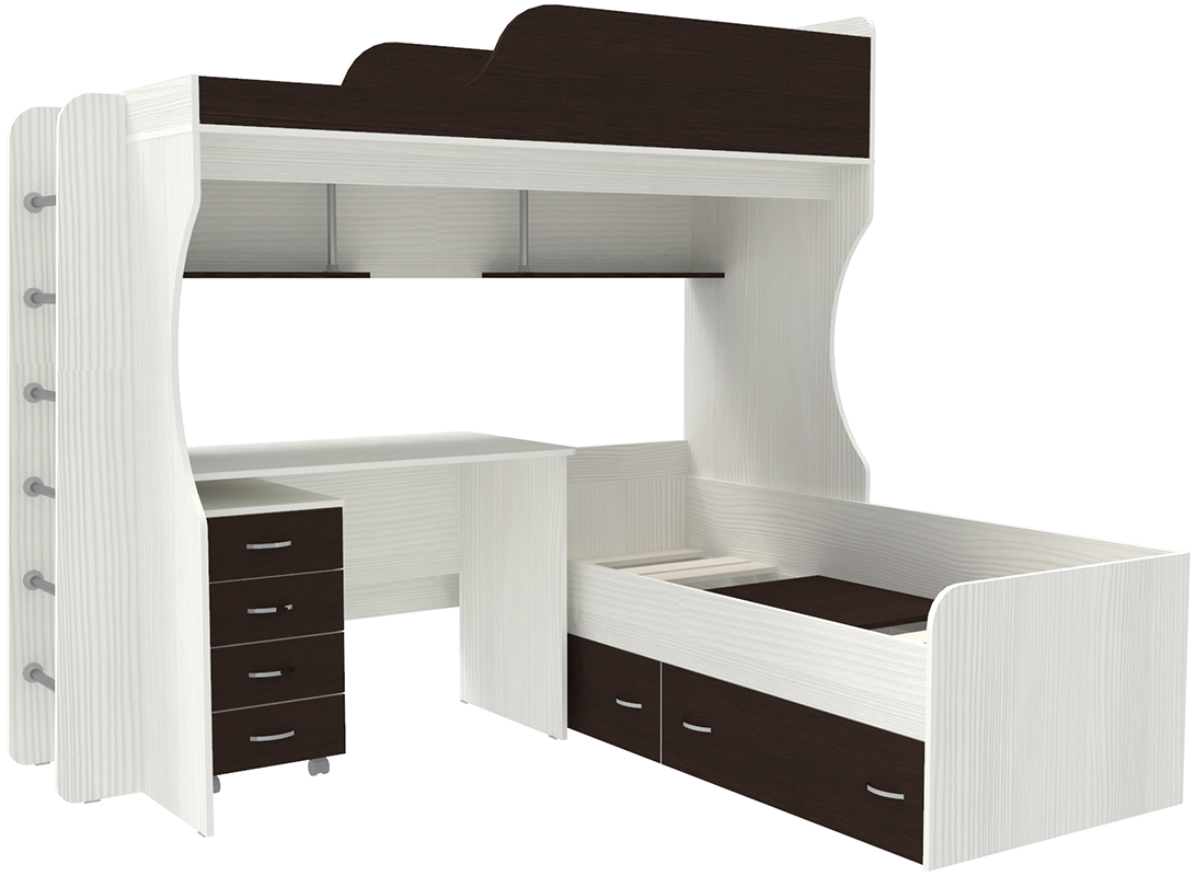 Детский уголок с двухъярусной кроватью и письменным столом для детей. Двухъярусная кровать Дуэт-5 сочетает в себе массу функционала и экономии места в детской комнате. Детская двухъярусная кровать для двоих детей занимает места не больше, чем для одного ребенка. Нижний ярус с кроватью не зависим от кровати чердака. Кровать нижнего яруса можно установить как параллельно верхнему ярусу, так и перпендикулярно, сбоку верхнего яруса. На цветных фасадах: цвет кромки - бежевый. Под верхним ярусом двухъярусной кровати Дуэт-5 имеются полку с отделениями для книг, учебников, тетрадей и письменных принадлежностей. Высота полки 284 мм, глубина 190 мм. Под кроватью нижнего яруса установлены ящики для постельного белья. Ящики на металлических, бесшумных, роликовых направляющих. Высота ящика 160 мм, глубина 600 мм. Главной особенностью детской двухъярусной кровати Дуэт-5 является независимость кровати нижнего яруса и стола, что позволяет расставлять мебель в удобном для Вас варианте.Габариты кровати верхнего яруса (Д*Г*В):193*84*192см Спальное место верхнего яруса:80 х 190 см. Габариты кровати нижнего яруса (Д*Г*В): 1895*815*650 мм. Спальное место нижнего яруса:75 х 185 см.Можно подобрать цвет, который понравится вам и вашему ребенку. Матрас к кровати приобретается отдельно.