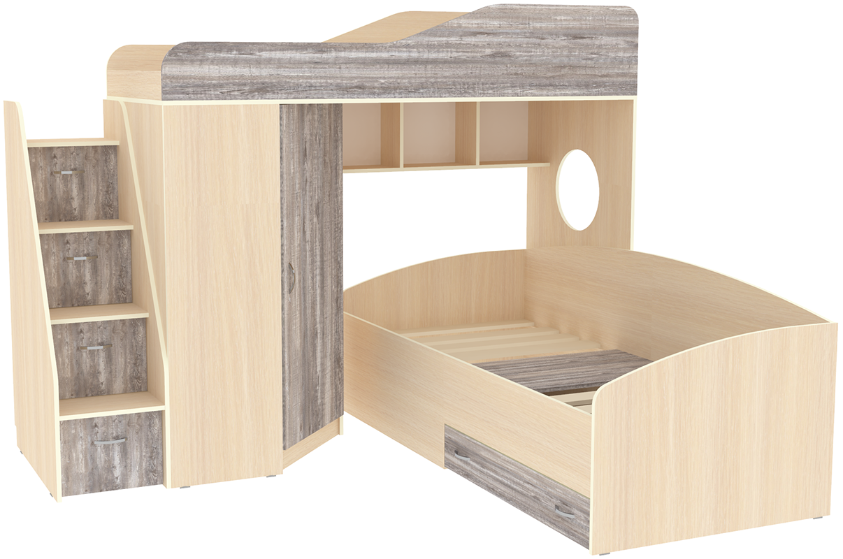 Кровать чердак Кадет 2 оснащен двумя спальными местами, лестницей в виде комода со ступенями в виде ящиков для хранения и угловым шкафом для одежды и белья. Данная модель подойдет как для детей младших классов, так и для детей более старшего возраста. Такая кровать поразит вас своей компактностью, вместительностью и практичностью. Комплектация: Кровать чердак ( спальное место 80 х 190 см), размеры (Д*Г*В): 234*84*172 см Встроенный угловой шкаф с полками и штангой для одежды Кровать нижняя ( спальное место 90 х 200 см), размеры (Д*Г*В): 204*94*66 см Лестница комод с ящиками Стеллаж для книг под спальным местом Основные параметры: Верхнее спальное место: 800*1900 мм Нижнее спальное место: 900*2000 мм Угловой шкаф, размеры (Д*Г*В): 832*832*1350 мм Высота борта: 350 мм Рекомендованная высота матраса: 100-150 мм Материалы, используемые при изготовлении:Ламинированная ДСП, края лестницы, борта кровати декорированы противоударной кромкой ПВХ.На цветных фасадах: цвет кромки - бежевый. Модель универсальна - сторона определяется при сборке. Матрасы в комплект не входят - приобретаются отдельно.Характеристики