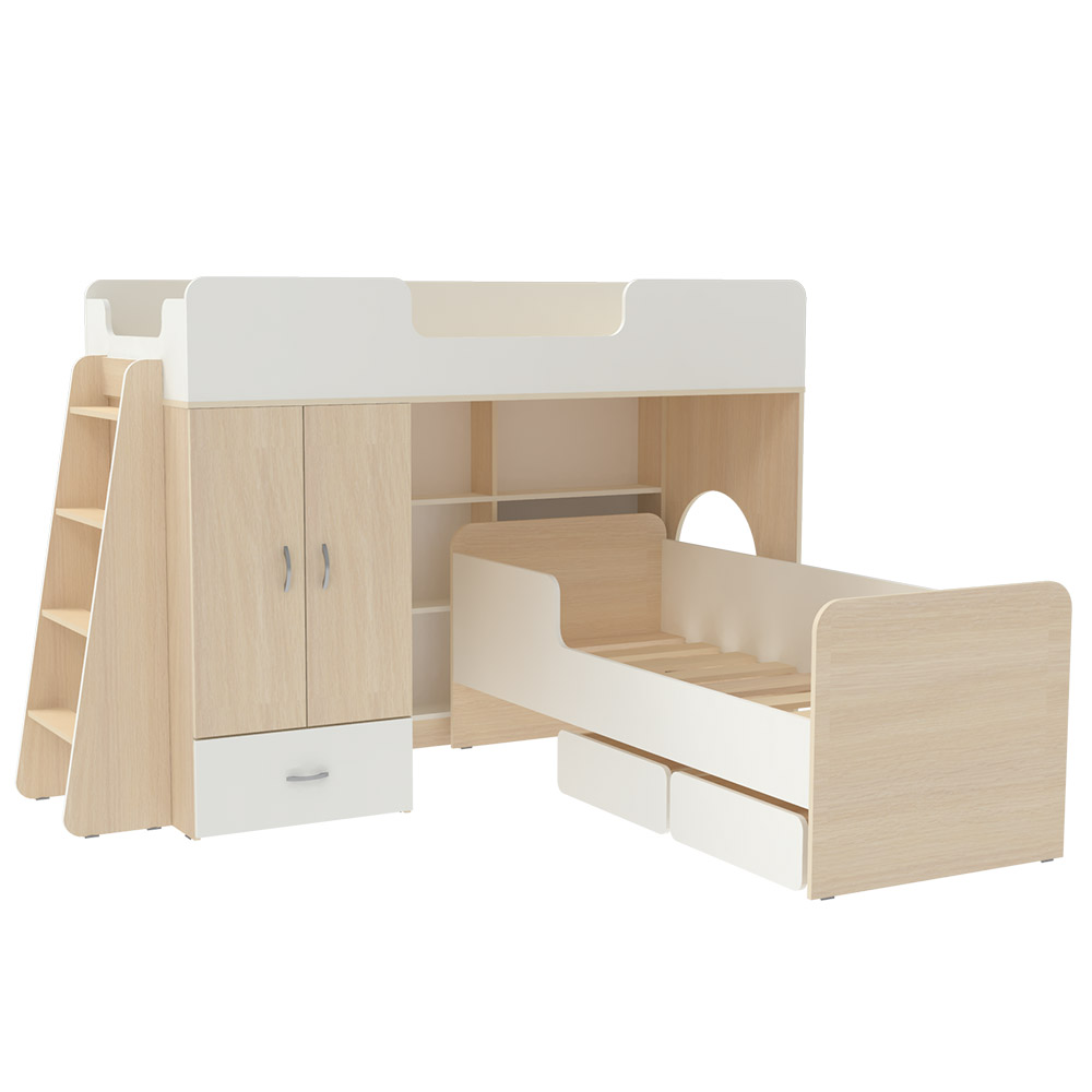 Двухъярусная кровать Л-3.11 – превосходный комплект мебели для двоих детей. Комплект занимает немного места - решение для площади малых габаритов,экономия пространства. Двухъярусная кровать с двумя спальными местами 1800х800 и 1750х700. Под верхним спальным местом располагаетсястеллаж,отлично подходящий для хранения игрушек.Стеллаж состоит из трех полок,разделенных на две секции – удобно для поддержания порядка и сортировки предметов. Вместительный шкафдля хранения одежды,белья,игрушек или иных вещей.Внизу шкафа располагаетсявыкатной ящик,в котором можно хранить отдельно мелкие предметы.Расположение ящика позволяет ребенку легко извлекать необходимые вещи самостоятельно. В комплект входит прямая четырехступенчатая лестницадля подъема на верхнюю кровать - подъём и спуск по лестнице способствует физическому развитию ребенка. Световое окно- дополнительное освещение,элемент для игры и возможность родителям наблюдать за ребенком. Нижнее спальное место представлено удивительнойкроватью-трансформером,имеющей четыре варианта сборки.Длинные бортики можно поставить в необходимое вам положение,опустив или подняв один или оба борта.Так можно открыть кровать(бортики внизу – тахта),поднять оба бортика – кроватка,оставить один бортик – диванчик или канапе.Под нижним спальным местом располагаются два удобных ящика на колёсиках.Ящики легко закатываются и выкатываются,с этим без труда справится ребенок.Отличные помощники в решение вопроса хранения игрушек и других вещей.Ящики идеально помещаются под фигурный бортик в вариантах «Тахта» и «Диванчик»,а если бортик поднят наверх – остается свободное пространство,которое можно использовать по вашему усмотрению. Модель универсальна - сторона определяется при сборке. Матрасы в комплект не входят - приобретаются отдельно.Характеристики