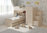 Двухъярусная кровать Л-3.10 – прекрасный комплект мебели для двоих детей. Комплект занимает немного места - решение для площади малых габаритов,экономия пространства. Двухъярусная кровать двумя спальными местами - 1800х800 и 1600х700. Под верхним спальным местом располагается стеллаж,отлично подходящий для хранения игрушек.Стеллаж состоит из трех полок,разделенных на две секции – удобно для поддержания порядка и сортировки предметов. Вместительный шкаф для хранения одежды,белья,игрушек или иных вещей.Внизу шкафа располагается выкатной ящик,в котором можно хранить отдельно мелкие предметы.Расположение ящика позволяет ребенку легко извлекать необходимые вещи самостоятельно. В комплект входитугловая лестница из трех ступенек-шкафчиков.Лестница одновременно выполняет функцию стеллажа. Световое окно - дополнительное освещение,элемент для игры и возможность родителям наблюдать за ребенком. Нижнее спальное место удобно заправлять,ребенку легко забираться и слезать,надёжно и практично. Под нижней кроватью два вместительных ящика,которые разработаны специально для данной модели.Идеально помещаются под кроватью,удобно выкатываются и закатываются.Незаменимые элементы организации хранения вещей. Нижняя кровать оборудована бортиком безопасности Л-01. Модель универсальна - сторона определяется при сборке. Матрасы в комплект не входят - приобретаются отдельно.Характеристики