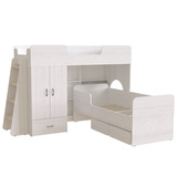 Двухъярусная кровать Л-3.11 – превосходный комплект мебели для двоих детей. Комплект занимает немного места - решение для площади малых габаритов,экономия пространства. Двухъярусная кровать с двумя спальными местами 1800х800 и 1750х700. Под верхним спальным местом располагаетсястеллаж,отлично подходящий для хранения игрушек.Стеллаж состоит из трех полок,разделенных на две секции – удобно для поддержания порядка и сортировки предметов. Вместительный шкафдля хранения одежды,белья,игрушек или иных вещей.Внизу шкафа располагаетсявыкатной ящик,в котором можно хранить отдельно мелкие предметы.Расположение ящика позволяет ребенку легко извлекать необходимые вещи самостоятельно. В комплект входит прямая четырехступенчатая лестницадля подъема на верхнюю кровать - подъём и спуск по лестнице способствует физическому развитию ребенка. Световое окно- дополнительное освещение,элемент для игры и возможность родителям наблюдать за ребенком. Нижнее спальное место представлено удивительнойкроватью-трансформером,имеющей четыре варианта сборки.Длинные бортики можно поставить в необходимое вам положение,опустив или подняв один или оба борта.Так можно открыть кровать(бортики внизу – тахта),поднять оба бортика – кроватка,оставить один бортик – диванчик или канапе.Под нижним спальным местом располагаются два удобных ящика на колёсиках.Ящики легко закатываются и выкатываются,с этим без труда справится ребенок.Отличные помощники в решение вопроса хранения игрушек и других вещей.Ящики идеально помещаются под фигурный бортик в вариантах «Тахта» и «Диванчик»,а если бортик поднят наверх – остается свободное пространство,которое можно использовать по вашему усмотрению. Модель универсальна - сторона определяется при сборке. Матрасы в комплект не входят - приобретаются отдельно.Характеристики