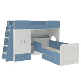 Двухъярусная кровать Л-3.11 – превосходный комплект мебели для двоих детей. Комплект занимает немного места - решение для площади малых габаритов,экономия пространства. Двухъярусная кровать с двумя спальными местами 1800х800 и 1750х700. Под верхним спальным местом располагаетсястеллаж,отлично подходящий для хранения игрушек.Стеллаж состоит из трех полок,разделенных на две секции – удобно для поддержания порядка и сортировки предметов. Вместительный шкафдля хранения одежды,белья,игрушек или иных вещей.Внизу шкафа располагаетсявыкатной ящик,в котором можно хранить отдельно мелкие предметы.Расположение ящика позволяет ребенку легко извлекать необходимые вещи самостоятельно. В комплект входит прямая четырехступенчатая лестницадля подъема на верхнюю кровать - подъём и спуск по лестнице способствует физическому развитию ребенка. Световое окно- дополнительное освещение,элемент для игры и возможность родителям наблюдать за ребенком. Нижнее спальное место представлено удивительнойкроватью-трансформером,имеющей четыре варианта сборки.Длинные бортики можно поставить в необходимое вам положение,опустив или подняв один или оба борта.Так можно открыть кровать(бортики внизу – тахта),поднять оба бортика – кроватка,оставить один бортик – диванчик или канапе.Под нижним спальным местом располагаются два удобных ящика на колёсиках.Ящики легко закатываются и выкатываются,с этим без труда справится ребенок.Отличные помощники в решение вопроса хранения игрушек и других вещей.Ящики идеально помещаются под фигурный бортик в вариантах «Тахта» и «Диванчик»,а если бортик поднят наверх – остается свободное пространство,которое можно использовать по вашему усмотрению. Модель универсальна - сторона определяется при сборке. Матрасы в комплект не входят - приобретаются отдельно.Характеристики