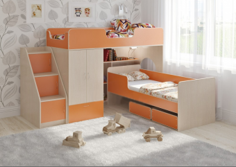 Двухъярусная кровать Л-3.12 – восхитительный набор мебели для двоих детей. Комплект занимает немного места - решение для площади малых габаритов,экономия пространства. Двухъярусная кровать с двумя спальными местами 1800х800 и 1750х700. Под верхним спальным местом располагаетсястеллаж,отлично подходящий для хранения игрушек.Стеллаж состоит из трех полок, разделенных на две секции – удобно для поддержания порядка и сортировки предметов. Вместительный шкафдля храненияодежды,белья,игрушек или иных вещей.Внизу шкафа располагаетсявыкатной ящик,в котором можно хранить отдельно мелкие предметы.Расположение ящика позволяет ребенку легко извлекать необходимые вещи самостоятельно. В комплект входит угловая лестница из трех ступенек-шкафчиков.Лестница одновременно выполняет функцию стеллажа. Световое окно- дополнительное освещение,элемент для игры и возможность родителям наблюдать за ребенком. Нижнее спальное место представлено удивительнойкроватью-трансформером,имеющей четыре варианта сборки.Длинные бортики можно поставить в необходимое вам положение,опустив или подняв один или оба борта.Так можно открыть кровать(бортики внизу – тахта),поднять оба бортика – кроватка,оставить один бортик – диванчик или канапе.Под нижним спальным местом располагаютсядва удобных ящика на колёсиках.Ящики легко закатываются и выкатываются,с этим без труда справится ребенок.Отличные помощники в решение вопроса хранения игрушек и других вещей.Ящики идеально помещаются под фигурный бортик в вариантах «Тахта» и «Диванчик»,а если бортик поднят наверх – остается свободное пространство,которое можно использовать по вашему усмотрению. Модель универсальна - сторона определяется при сборке. Матрасы в комплект не входят - приобретаются отдельно.Характеристики