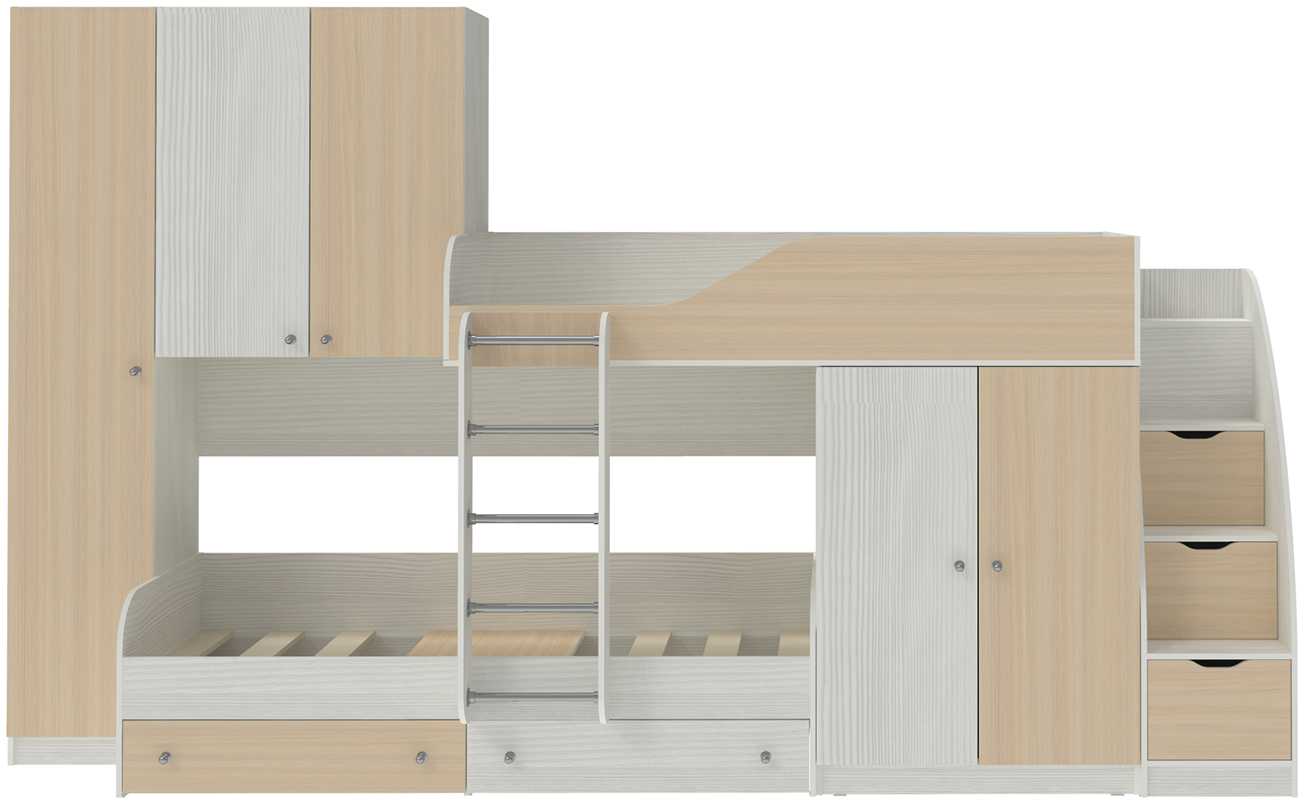 Двухъярусная кровать Лео с лестницей комодом Белое Дерево Дуб Молочный