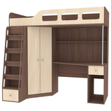 Многофункциональный комплекс для младших школьников и подростков. Особенность модели в компактных размерах, что позволит освободить в комнате больше пространства для игр. Разнообразие цветовых решений позволит подобрать комплекс под любой интерьер. В составе модуля есть удобная кровать-чердак с безопасным бортиком. Внизу располагается рабочее место с компьютерным столом и полкой для книг. Стол оборудован нишей для системного блока и ящиком для канцелярских принадлежностей. В конструкции комплекса продуман вместительный угловой шкаф со штангой и полками. Широкая лестница позволит легко взобраться на второй этаж, а в небольшом ящике в основании лесенки будет удобно хранить различные мелочи. Модель универсальна - сторона определяется при сборке. Цвет кромки на цветных фасадах - светло-бежевая. Матрасы в комплект не входят - приобретаются отдельно.Характеристики