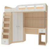 Многофункциональный комплекс для младших школьников и подростков. Особенность модели в компактных размерах, что позволит освободить в комнате больше пространства для игр. Разнообразие цветовых решений позволит подобрать комплекс под любой интерьер. В составе модуля есть удобная кровать-чердак с безопасным бортиком. Внизу располагается рабочее место с компьютерным столом и полкой для книг. Стол оборудован нишей для системного блока и ящиком для канцелярских принадлежностей. В конструкции комплекса продуман вместительный угловой шкаф со штангой и полками. Широкая лестница позволит легко взобраться на второй этаж, а в небольшом ящике в основании лесенки будет удобно хранить различные мелочи. Модель универсальна - сторона определяется при сборке. Цвет кромки на цветных фасадах - светло-бежевая. Матрасы в комплект не входят - приобретаются отдельно.Характеристики