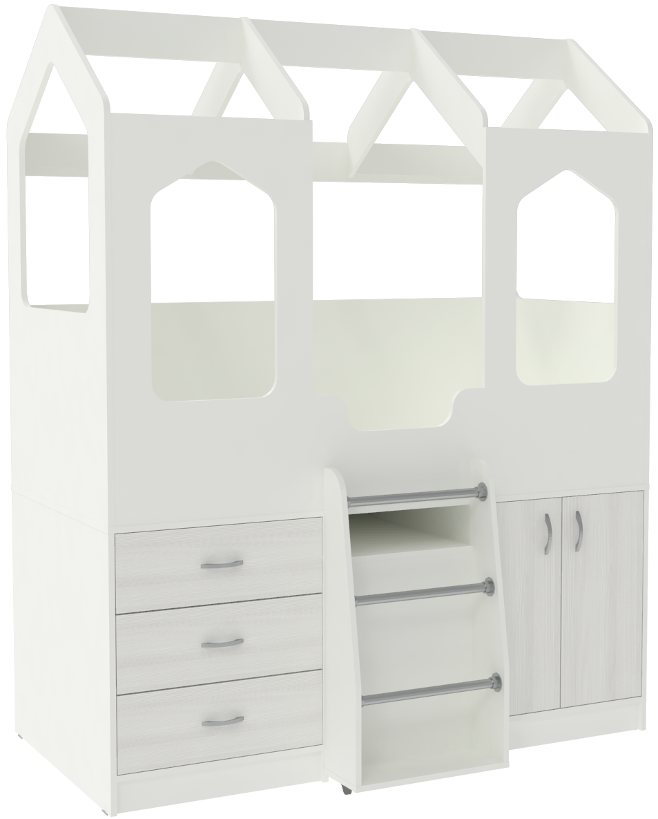 Кровать-чердак Домик Сказка сочетает в себеспальное место с практичным нижним ярусом для игр. В отличие от других моделей серии Домик, она оснащена выдвижным столиком на колесиках,который также используется для подъема на верхний ярус за счет прикрепленной сбоку лестницы. Cтол выдвигается из под кровати полностью. Необходимые предметы для сна, игр и занятий размещены на небольшой площади, что очень удобно, когда место в спальне ограничено. Верхний ярус дополнен бортиком, а с передней стороны двумя большими окошками, создающими ощущение настоящего сказочного домика. На деталях в цвете Лайм, Розовый, Ирис, Оранжевый и Синий цвет кромки – светло-бежевый. Спальное место размером 160х80 см.Характеристики