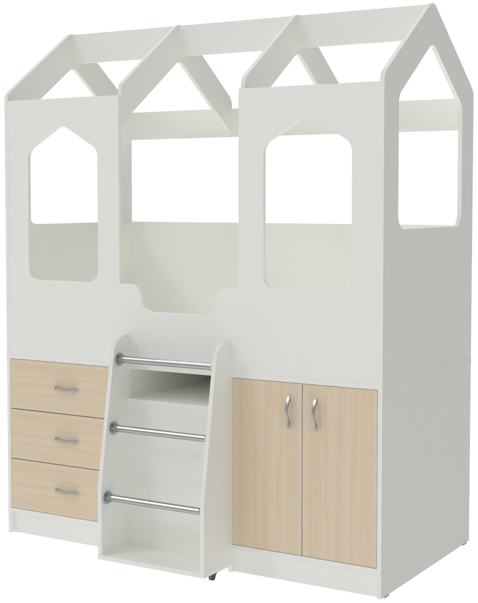 Кровать-чердак Домик Сказка сочетает в себеспальное место с практичным нижним ярусом для игр. В отличие от других моделей серии Домик, она оснащена выдвижным столиком на колесиках,который также используется для подъема на верхний ярус за счет прикрепленной сбоку лестницы. Cтол выдвигается из под кровати полностью. Необходимые предметы для сна, игр и занятий размещены на небольшой площади, что очень удобно, когда место в спальне ограничено. Верхний ярус дополнен бортиком, а с передней стороны двумя большими окошками, создающими ощущение настоящего сказочного домика. На деталях в цвете Лайм, Розовый, Ирис, Оранжевый и Синий цвет кромки – светло-бежевый. Спальное место размером 160х80 см.Характеристики