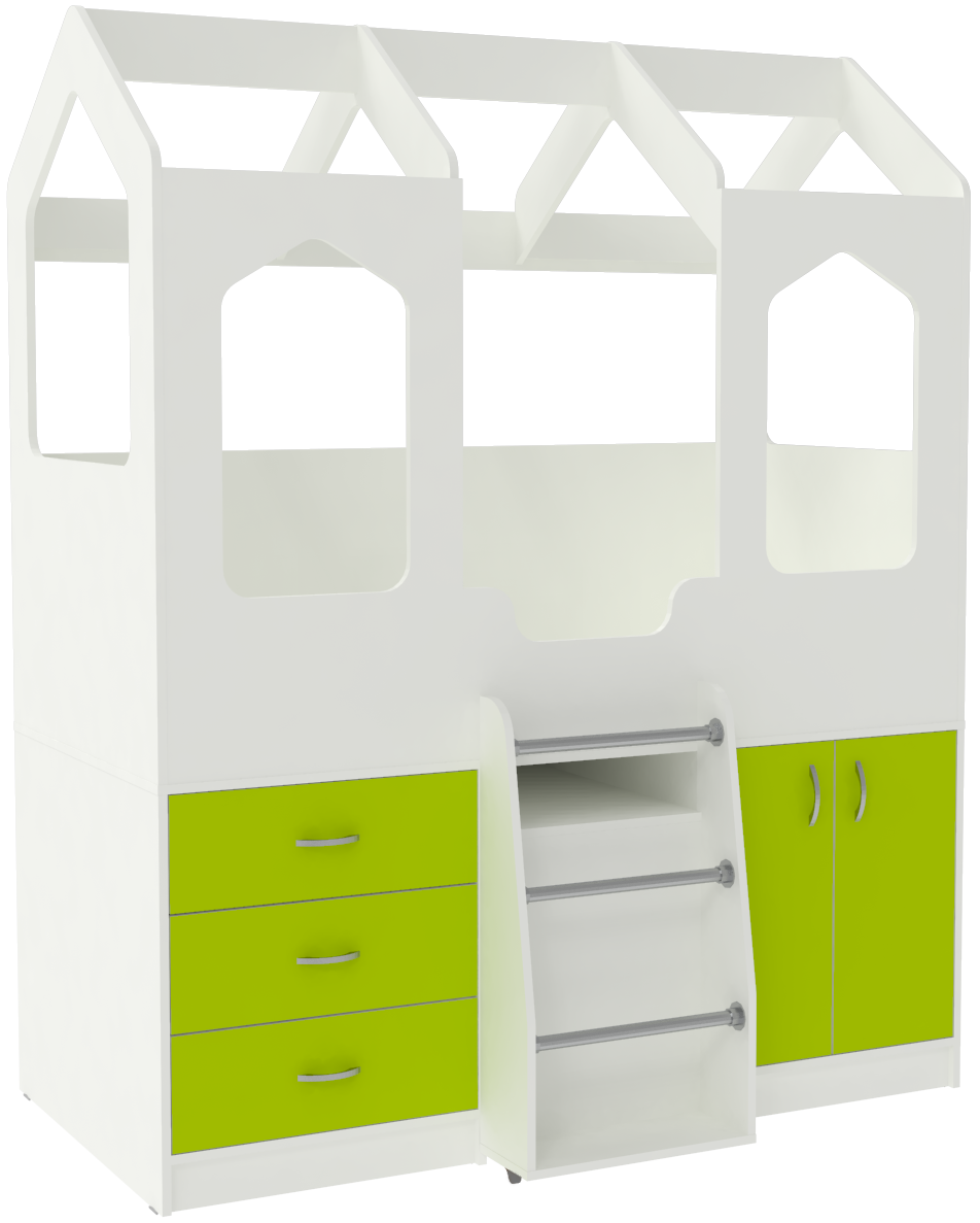 Кровать-чердак Домик Сказка сочетает в себеспальное место с практичным нижним ярусом для игр. В отличие от других моделей серии Домик, она оснащена выдвижным столиком на колесиках,который также используется для подъема на верхний ярус за счет прикрепленной сбоку лестницы. Cтол выдвигается из под кровати полностью. Необходимые предметы для сна, игр и занятий размещены на небольшой площади, что очень удобно, когда место в спальне ограничено. Верхний ярус дополнен бортиком, а с передней стороны двумя большими окошками, создающими ощущение настоящего сказочного домика. На деталях в цвете Лайм, Розовый, Ирис, Оранжевый и Синий цвет кромки – светло-бежевый. Спальное место размером 160х80 см.Характеристики