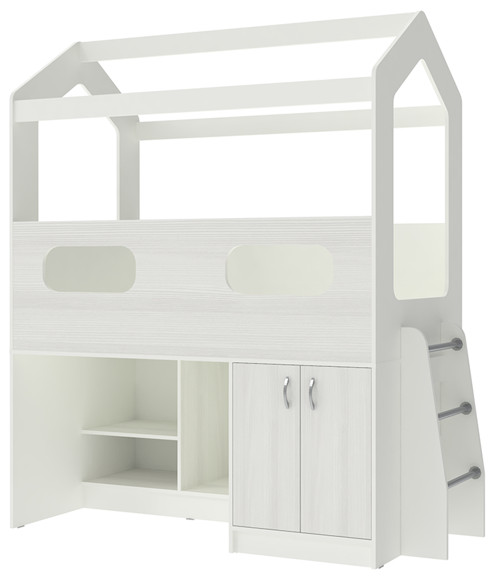 Кровать-чердак ДС-12 — уютный домик с нижним ярусом для игры, разработан для детей от 3-х лет. Передний бортик с окошком имеет высоту 51,5 см. Можно оформить заказ в цвете Белое дерево или с цветным фасадом. На деталях в цвете Лайм, Розовый, Ирис, Оранжевый и Синий цвет кромки – светло-бежевый. Под спальным местом можно легко организовать игровую зону для ребенка с полочками и шкафчиком, или же удобное и вместительное место для хранения. Компактная и функциональная кровать с личным игровым пространством для детей не занимает много места и станет прекрасным решением для небольших квартир. Матрас приобретается отдельно.Характеристики