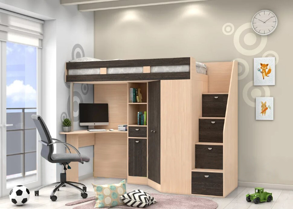 кровать-чердак Golden kids 6 Комплектация: лестница - комод с тремя выдвигающимися ящиками, угловой шкаф для одежды (штанга + полки), стол с тумбой и полки для книг. Спальное место 190/80см. Нагрузка на спальное место (с учетом матраса) 120кг. Дно - цельный лист ДСП. Модель собирается направо или налево. Цвет кромки на цветных фасадах - светло-бежевый. Матрас не входит в стоимость, его вы можете подобрать и приобрести дополнительно.Характеристики