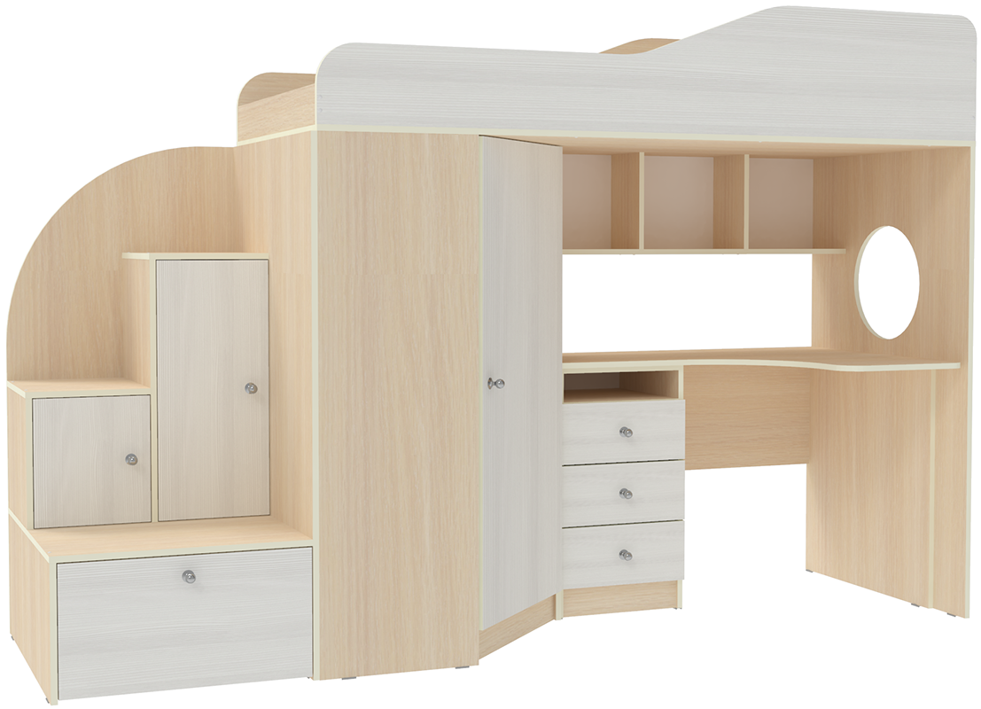 Кровать чердак Кадет 1 оснащен одним спальным местом, необычными ступенями с дверцами для хранения игрушек, письменным столом с тремя выдвижными ящиками под столешницей, полкой над столешницей и угловым шкафом для одежды. Данная модель подойдет как для детей младших классов, так и для детей более старшего возраста. Такая модель кровати поразит вас своей компактностью, вместительностью и практичностью. Комплектация:- Кровать чердак ( спальное место 80 х 190 см), размеры (Д*Г*В): 1932*832*1716 мм
